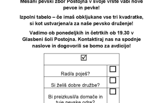 Če koga zanima petje pri našem zboru je seveda vabljen, da se nam pridruži. Pevske vaje so po novem ob torkih in četrtkih zvečer. Lepo vabljeni, da se udeležite avdicije in [...]